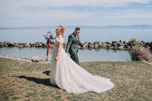 Nous nous sommes ensuite retrouvés devant le lac Léman pour leur séance découverte, à Amphion-les-Bains au Parc du Mottay. Effet "wahou" garanti ! Arnaud n'en croyait pas ses yeux lorsqu'il a découvert Julie avec sa magnifique robe de mariée.